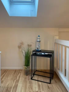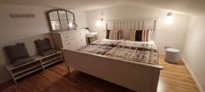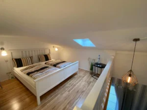 Es handelt sich um eine liebevoll eingerichtete und ausgebaute 2,5-Zimmer-Wohnung mit privatem Außenbereich. Die voll ausgestattete Wohnung bietet Platz für 2-4 Personen. Sie verfügt über ein Schlafzimmer mit Doppelbett und 2 weitere Schlafplätze im Doppelbett der Galerie.